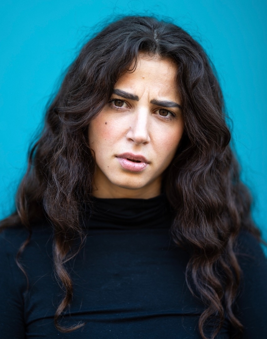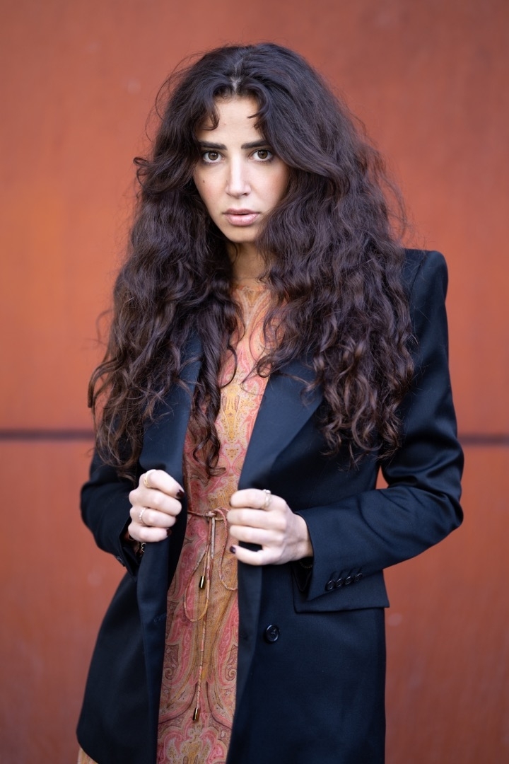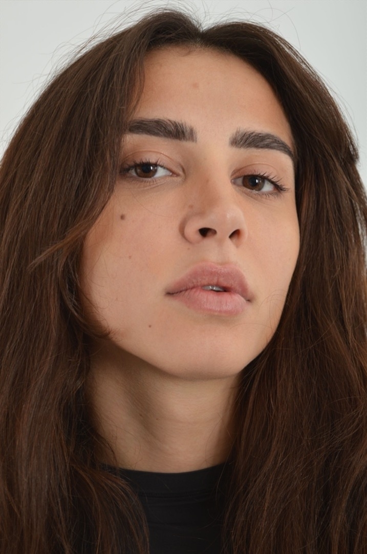 Grain de beauté sur la joue / cheveux très épais et bouclés / regard expressif. 0 tatouages, pas de piercing.