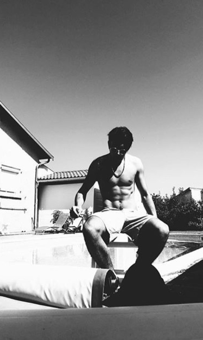 Plusieurs tatouages dont un gros sur la poitrine.
