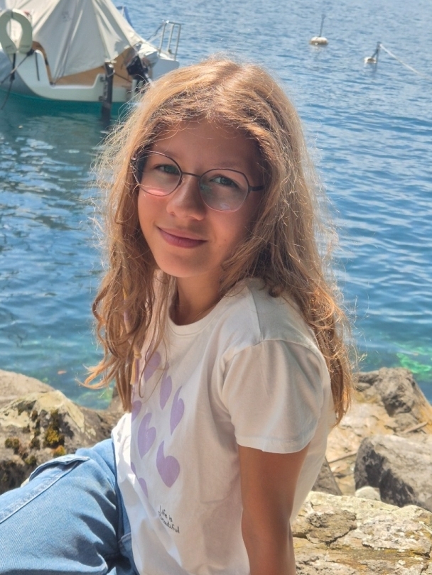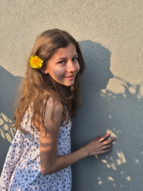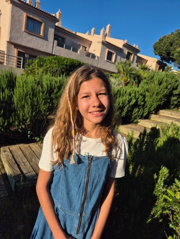 Une fillette de 12 ans qui aime la musique et le chant parle couramment trois langues : le portugais, le français et l’anglais. Une sportive en natation synchronisée.