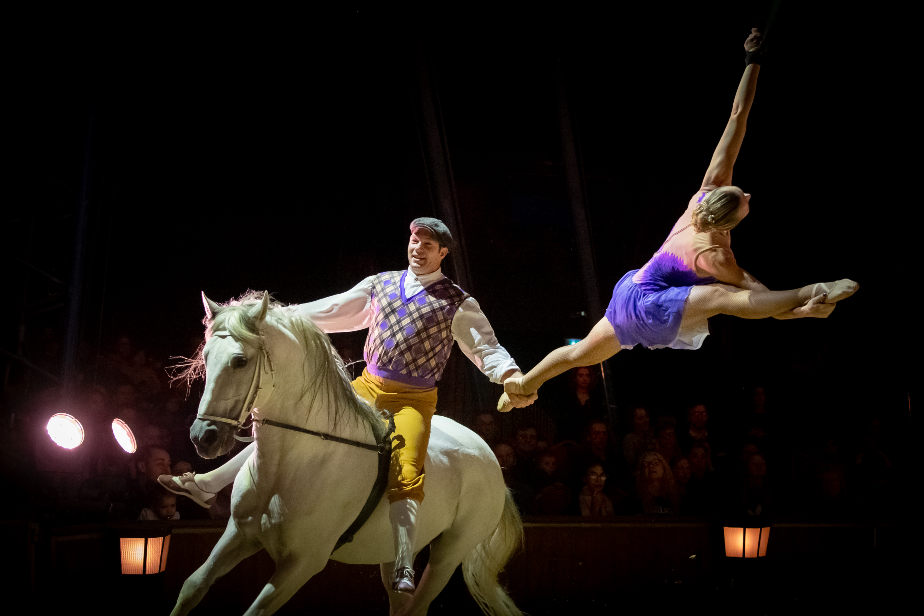 FG: Bonjour, je m’appelle Firmin Gruss et je suis à la fois acrobate à cheval entouré dans la piste par toute ma famille, équilibriste sur échelle libre, tromboniste et j’assure un duo équestre et aérien avec mon épouse, Svetlana.