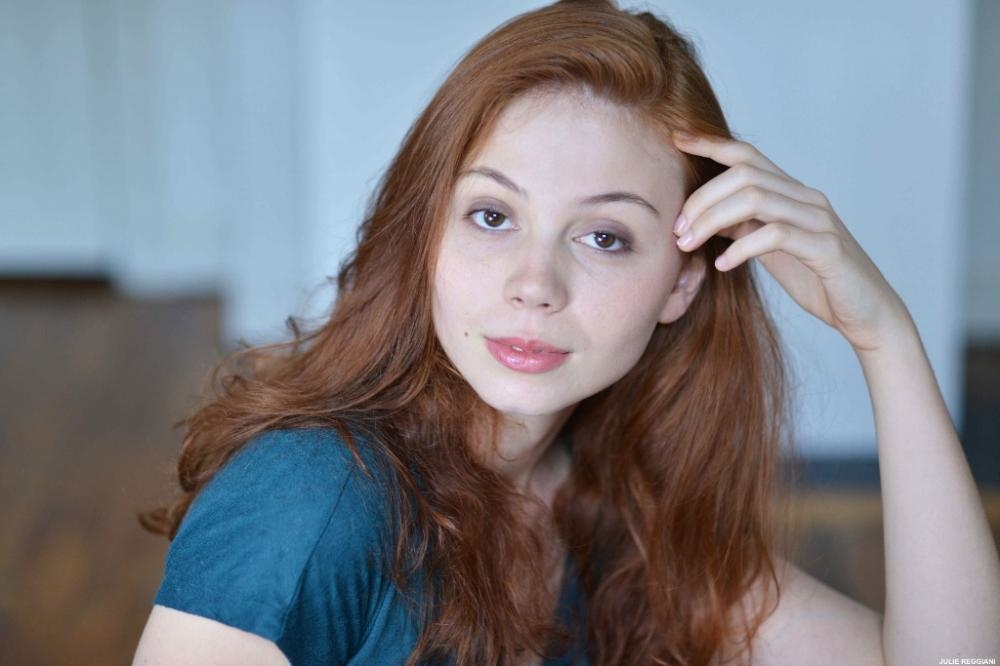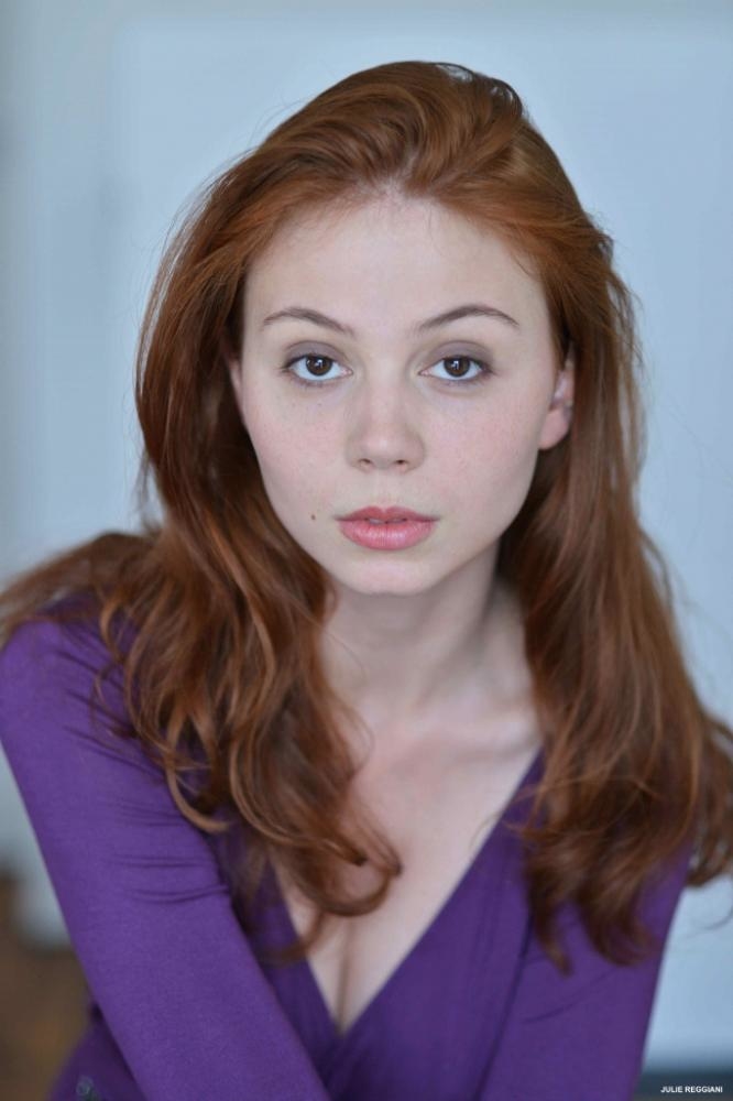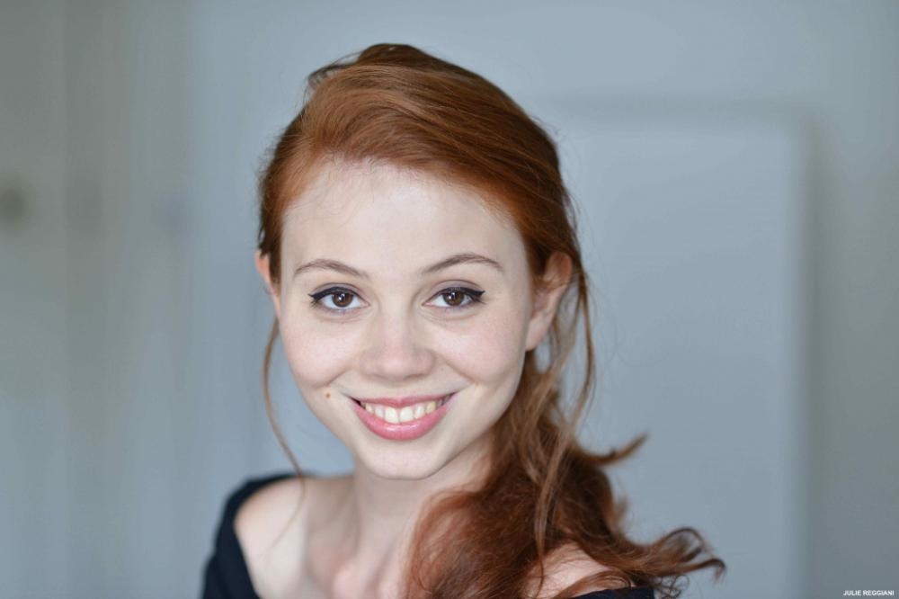 Cheveux d'un roux intense, grain de beauté au coin de la bouche, peau très claire