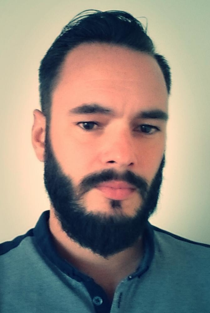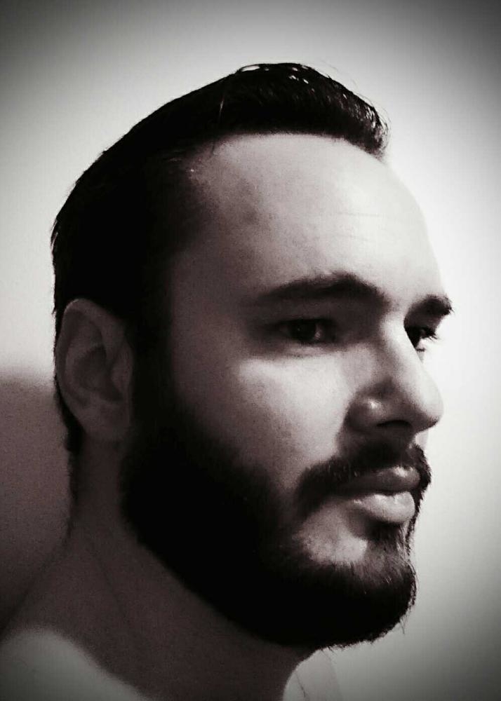Légères fossettes quand je souris, des yeux en amandes, barbu.