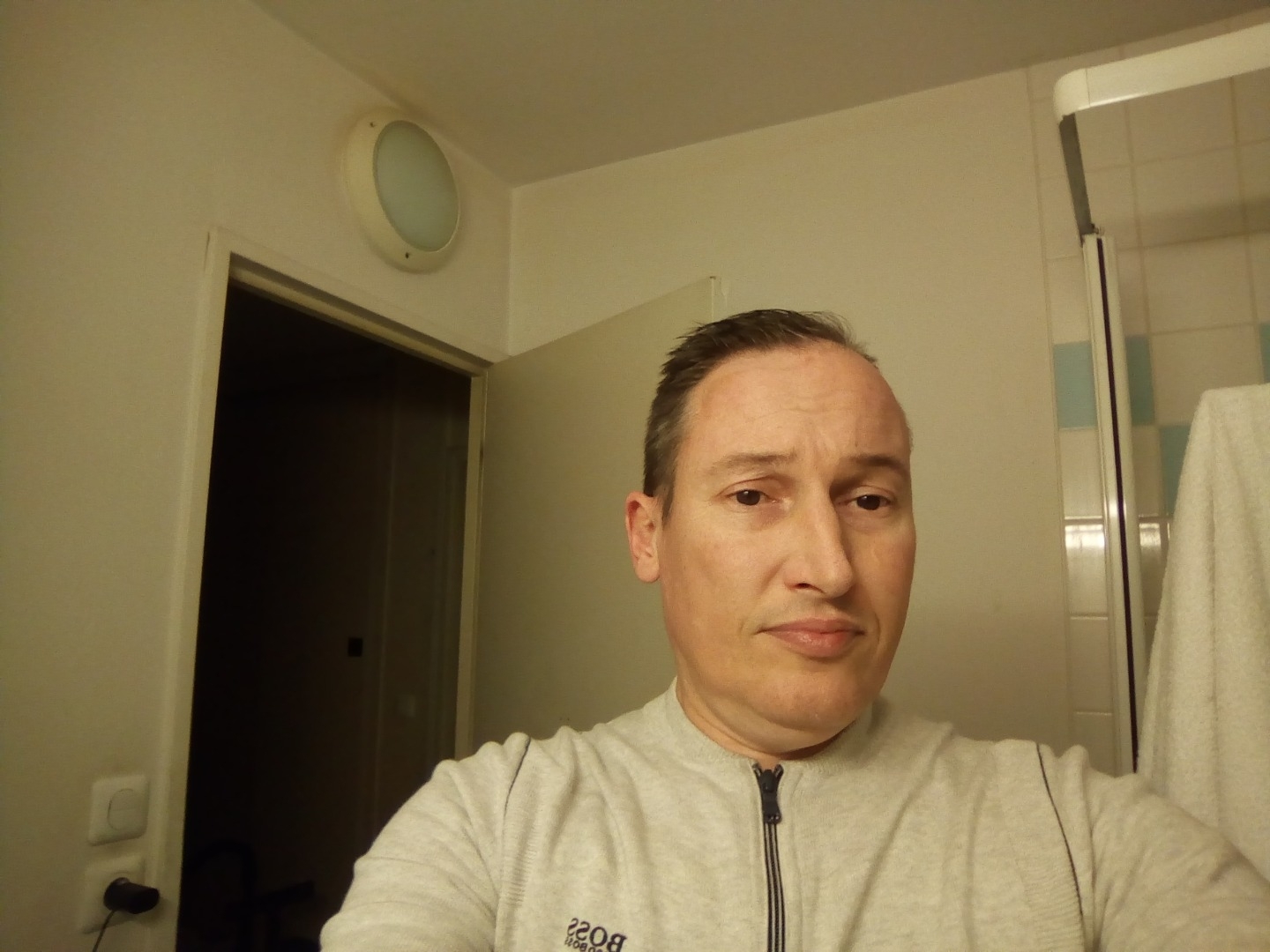 Cheveux légèrement poivre et sel, silhouette fine et sportive..