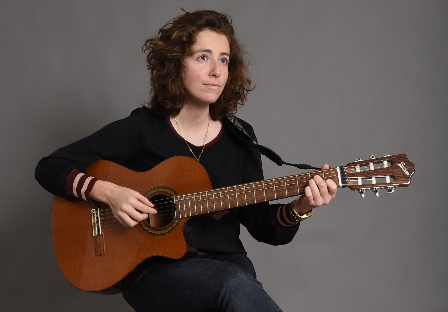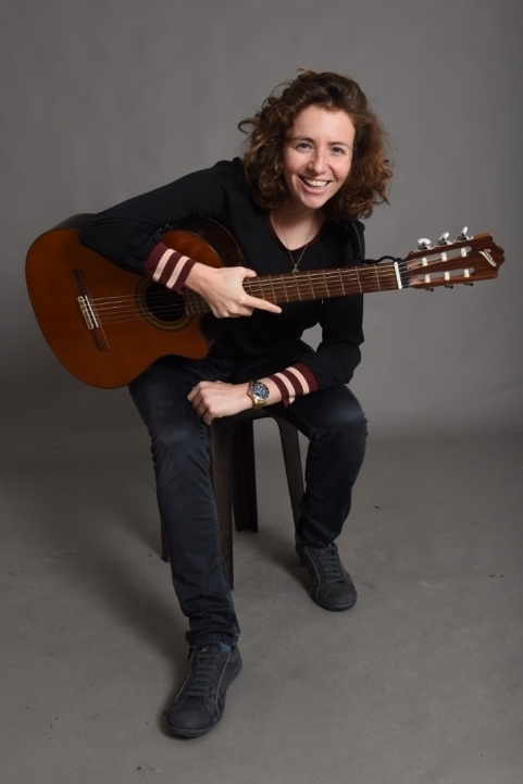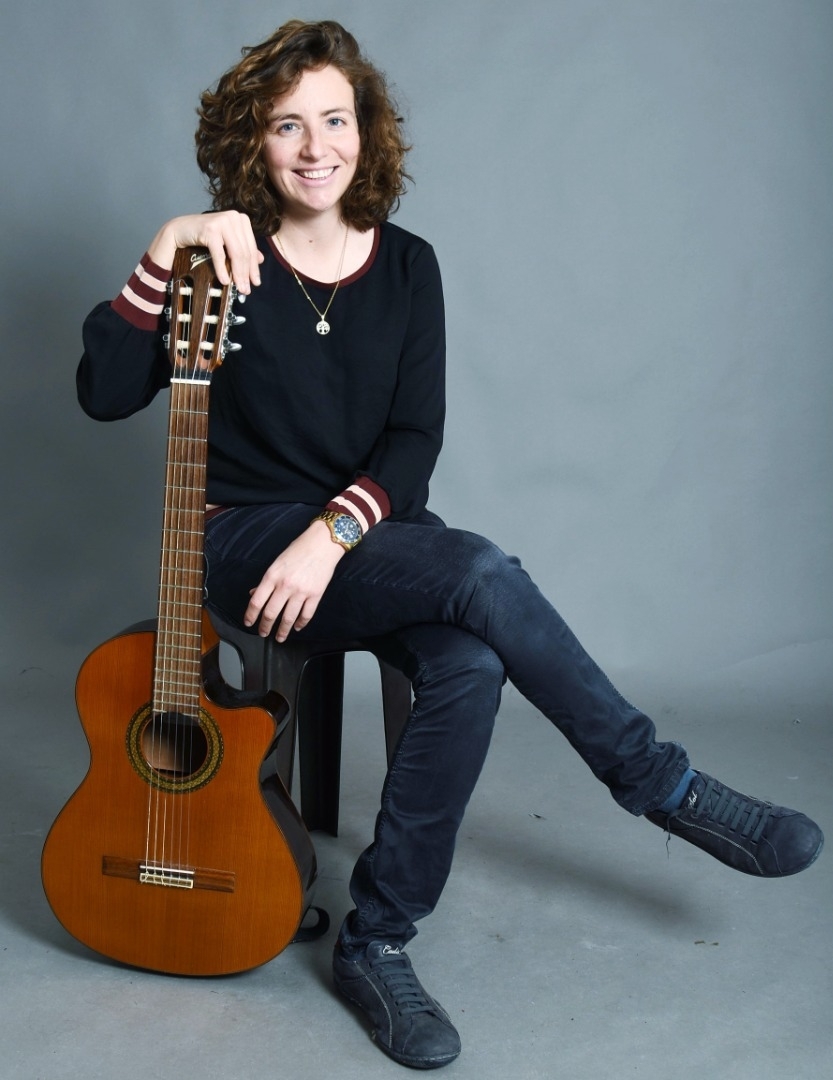 Gauchère, yeux gris bleus, multi instrumentiste: guitare, piano, saxophoniste, chanteuse.