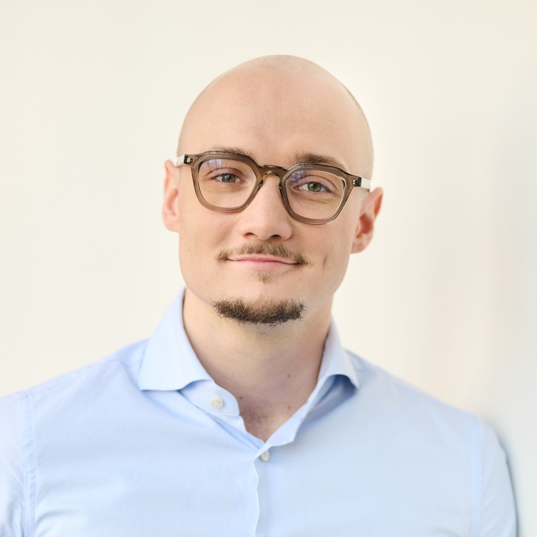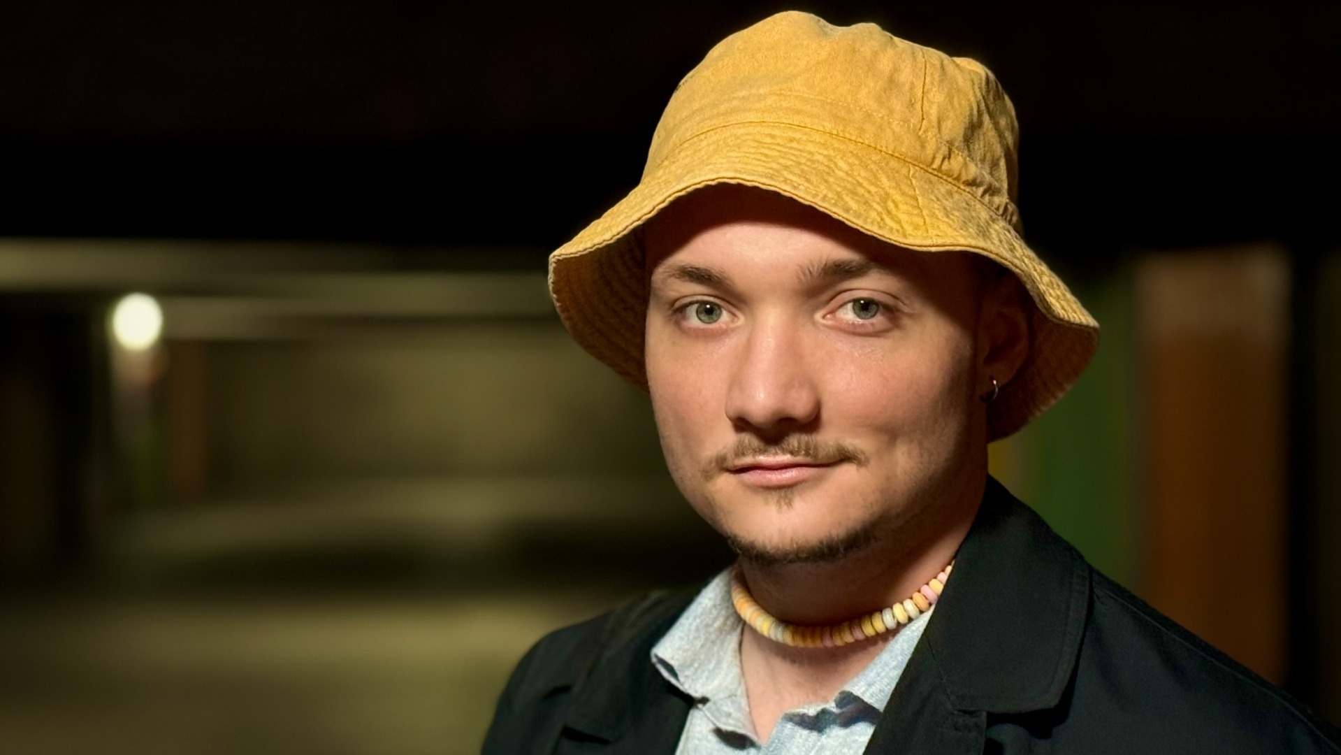 yeux gris-vert / chauve.