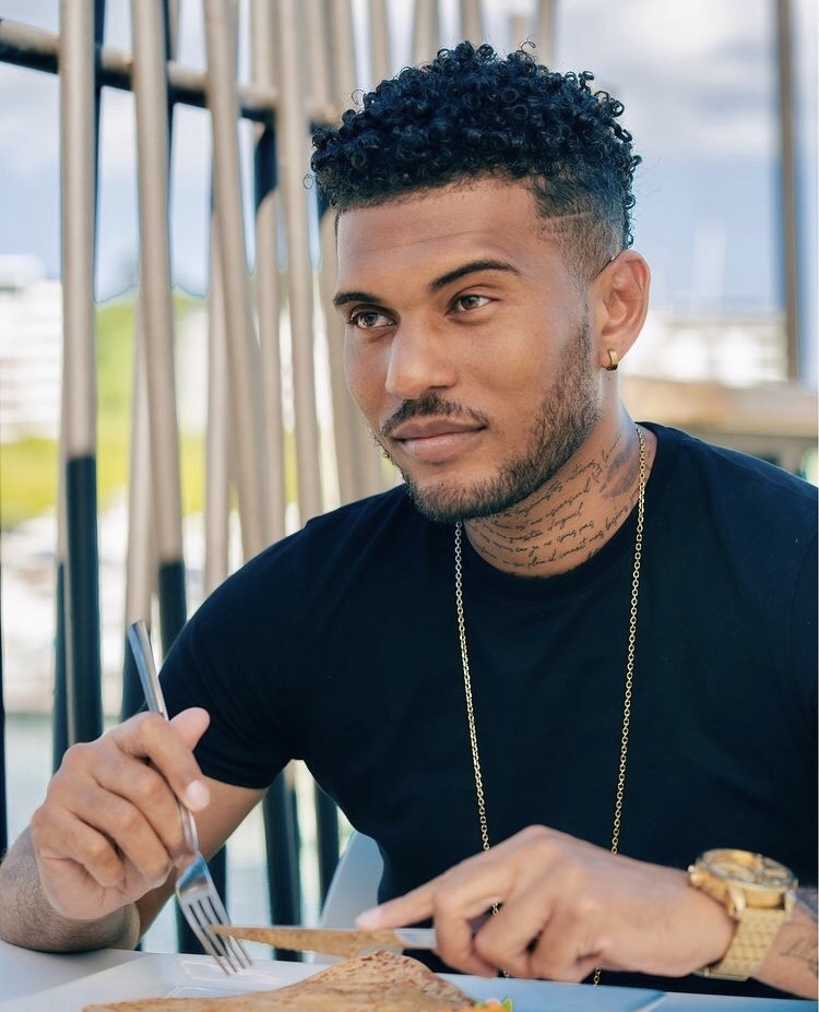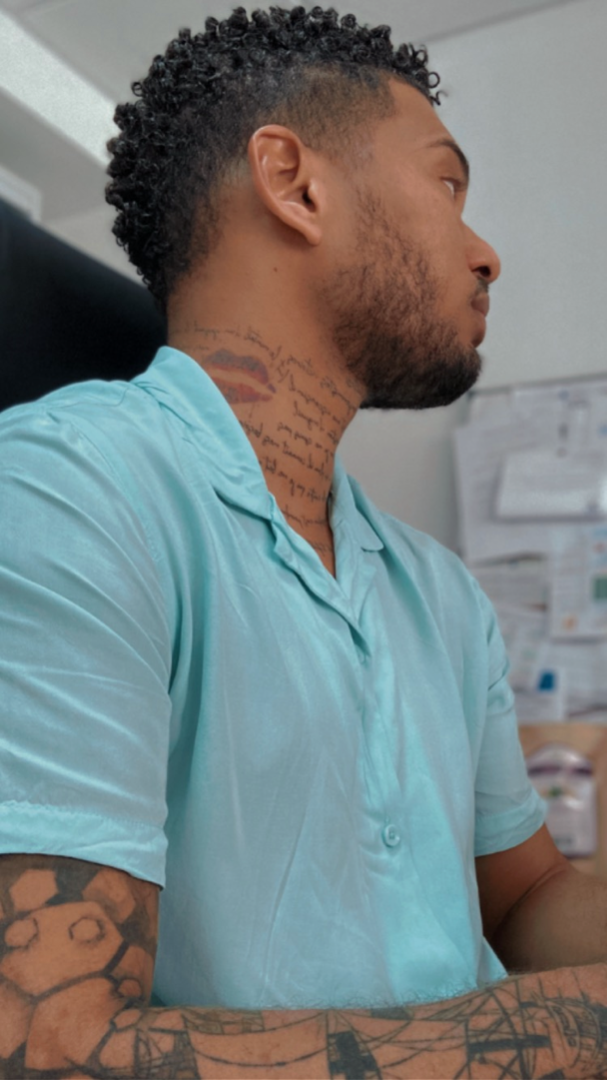 Tatouages (cou, bras gauche, torse, cotes) et piercings (oreilles)