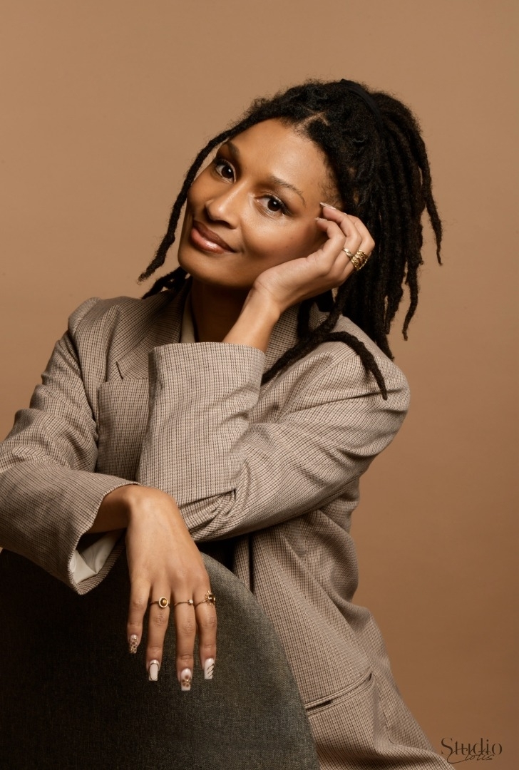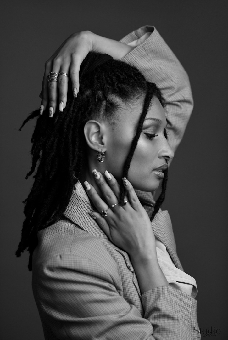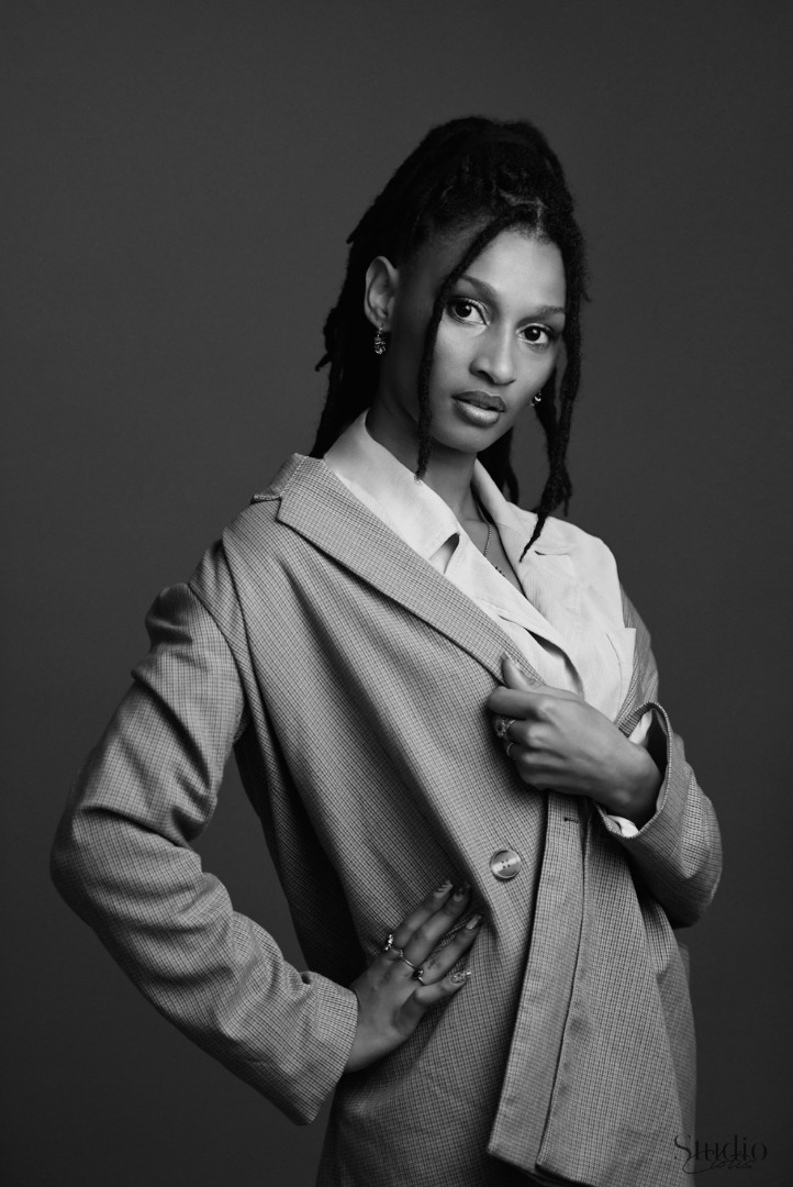 Cheveux locksés, silhouette élancée, traits naturels