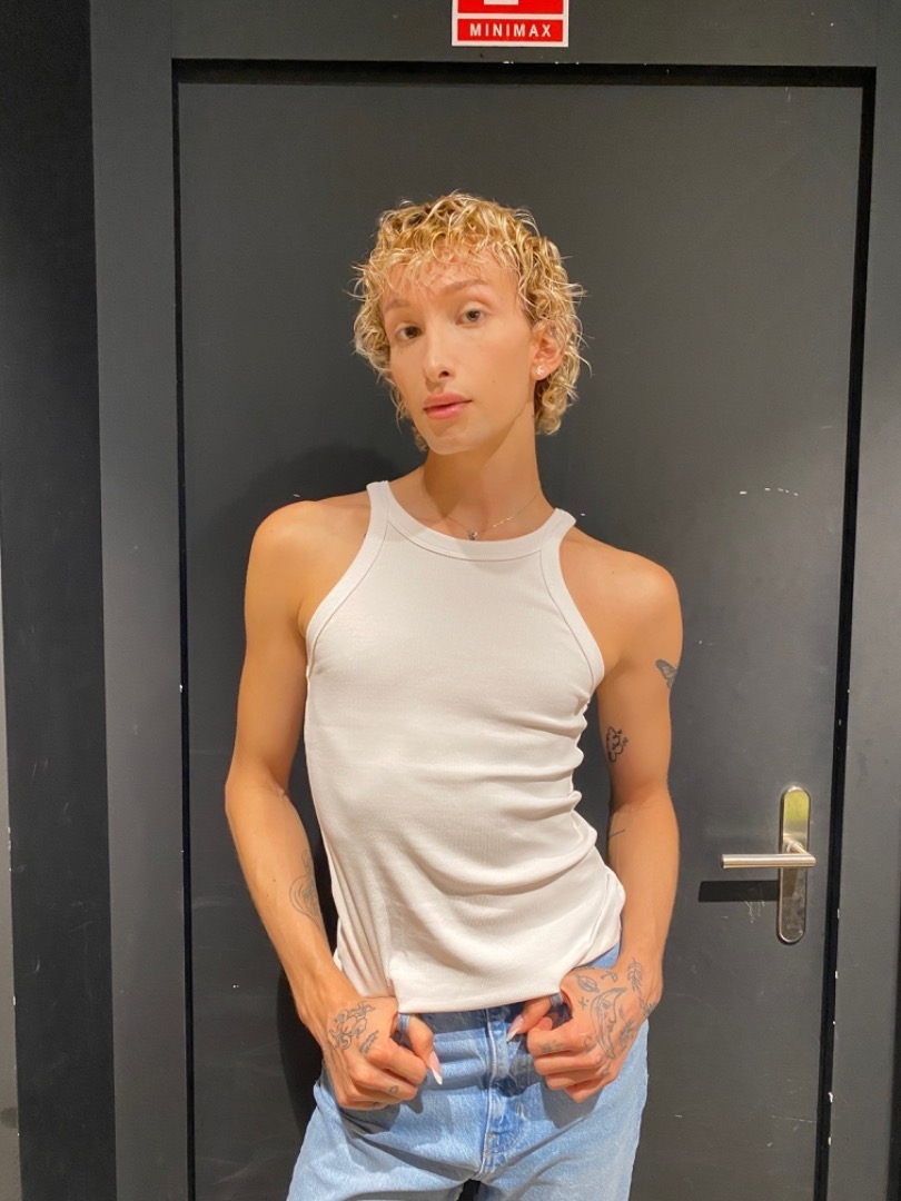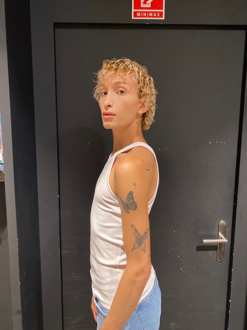 tatouages sur les mains, visage doux, silhouette svelte.