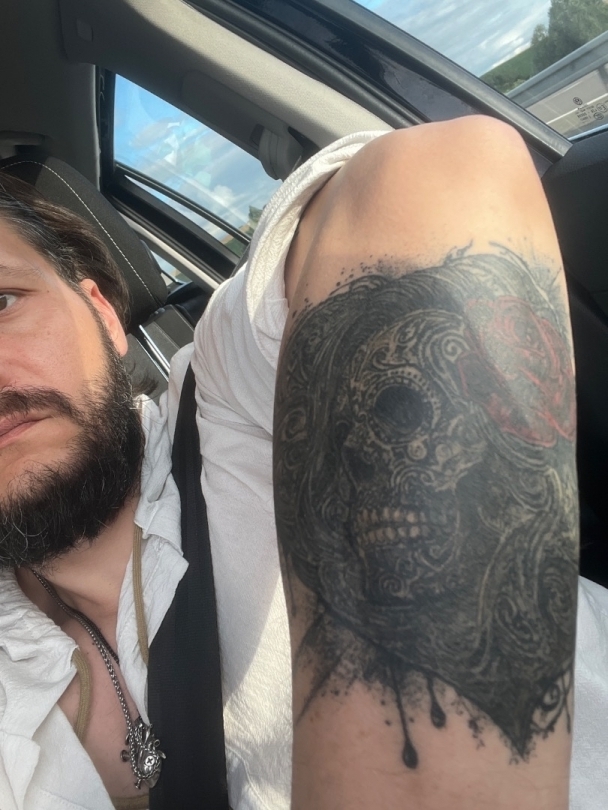 – Tatouage sur le torse (empreinte de lèvres avec tête de mort intégrée)