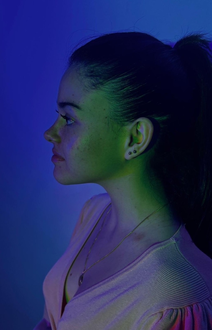 piercing nombril et aux oreilles, taches de rousseurs au visage, lunettes de repos